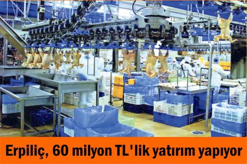 Erpiliç'te yatırımların durmayacağını vurgulayan Ericek, yaklaşık 60 milyon TL'lik yatırım yaptıklarına dikkat çekti. Mudurnu ilçesinde kuluçka inşaatlarının devam ettiği bilgisini veren Genel Müdür Yardımcısı, haftalık 2 milyon 750 bin yumurta basma kapasitesine sahip tesislerinin 2 aya kadar faaliyete geçeceğini ancak ilk etapta, haftalık 1 milyon 350 bin yumurta basmayı hedeflediklerini söyledi. Ericek'in verdiği bilgiye göre, bu yatırımın bedeli 10 milyon TL. Yeni gelecek makinelerle birlikte bu rakam 15 milyon TL'yi bulacak. Mudurnu Nallıhan yolu üzerinde Tımaraktaş bölgesinde 100 bin kapasiteli tavuk üretim tesisinin inşaatına başlanıyor. Burada yaklaşık 100 kişi çalışacak. Ayrıca, Bolu'daki kesimhaneye ek yatırımlar var. İleri işleme tesisi ve yeni bir kesimhane yapacakları bilgisini veren Ericek, "Bu yatırım 30 milyon TL'yi geçer. Yeni yem fabrikamızın da temelini attık. Fabrika muhtemelen 15 milyon TL'yi bulur." şeklinde konuştu.