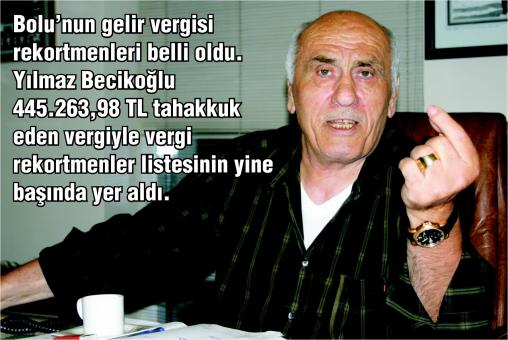2010 gelirleri için Mart ayında verilen yıllık gelir vergisi ve gayri menkul sermaye iradı beyannameleri üzerinden yapılan değerlendirmeler tamamlandı ve Bolu’nun en fazla gelir vergisi ödeyecek ilk 100 ismi belirlendi. Yıllardır Bolu'nun vergi rekortmenliği tahtını kimseye bırakmayan İşadamı Yılmaz Becikoğlu, 445.263,98 TL tahakkuk eden vergiyle vergi rekortmeni oldu. Bu yıl listenin ikinci sırasına sürpriz bir isim girdi. Listede ikinci sırayı 259.312,81 TL deri debbağcılığı yapan Gerede’den İhsan Yıldız aldı.