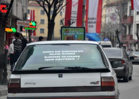 Yurdun birçok bölgesinde vatandaşların dikkatini çeken kamyon arkası yazılarından sonra şimdi de otomobillerin camlarında yazılı iletiler moda oldu. İzzet Baysal Caddesi'nde trafikte seyreden bir araç kaldırımda yürüyen vatandaşların dikkatini çekti. Sitemkar bir aşık, sesini duyurmaya çalıştığı sevgilisine mesaj göndermek için otomobilinin camına anlamlı bir söz yazdı. Herkesin merakla dönüp baktığı otomobilin camında, "Sanma ki beni sevmiyorsun diye kalbim yetimdir. Ölürüm de yalvarmam, aşkım asaletimdir" yazısı dikkat çekti. Otomobilin arka camındaki yazıyı okuyan vatandaşlar, bir yandan aşık olan şahsın ne söylemek istediğini anlamaya çalışırken bir yandan da "Vay be, ne aşkmış" diye destek oldular.