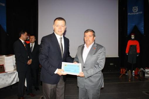 Bölge Müdürlüğümüz Aladağ Orman İşletme Müdürlüğünce organize edilen ve FSC (Orman Yönetim Sertifikasyonu Sistemi) kapsamında "Üretim Tekniği ve İş Güvenliği" konusunda eğitime katılan Orman Köylüleri ve Kooperatif üyelerine yönelik olarak düzenlenen "Sertifika dağıtım töreni Bolu'da yapıldı. Yaklaşık olarak 250 orman köylüsünün katıldığı törene, Orman Genel Müdürlüğü İşletme ve Pazarlama Daire Başkanı Kenan AKYÜZ, Bölge Müdürü Sırrı KÖSTERELİ, İ.Ü.Orman Fakültesi Öğretim üyesi Yrd. Doç. Dr. M.Osman ENGÜR, OGM İşletme ve Pazarlama Dairesi Şube Müdürleri Selami CİLAN ve Ramazan BALİ, Bolu'da bulunan Kamu Kurum ve Kuruluşlarının temsilcileri, Köy Muhtarları, Orman Kooperatif Başkanları, Sivil Toplum örgütü üyeleri ve Bölge Müdürlüğü teknik elemanları katıldı Bölge Müdürlüğü Aladağ Orman İşletme Müdürlüğünce özel olarak bastırılan ve üretimde çalışan orman köylülerine yönelik olarak hazırlanan "Odun Üretiminde Çalışanlar İçin El Kitabı"nın ve sertifikaların dağıtılmasının ardından, Husquvarna firmasının sponsorluğunda ve çekilişle orman köylülerine; 1 adet motorlu testere, 1 adet motorlu testerenin kesemediği koruyucu iş pantolonu, 1 adet baret, 1 adet koruyucu eldiven ve 2 adet koruyucu gözlük dağıtıldı