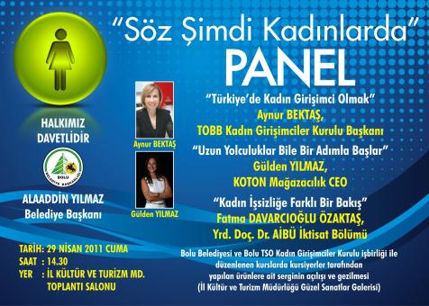 . Panelde “Türkiye’de Kadın Girişimci Olmak” konulu ilk sunumu TOBB Kadın Girişimciler Kurulu Başkanı Aynur Bektaş, “Uzun Yolculuklar Bile Bir Adımla Başlar” adlı sunumu Koton Mağazacılık CEO adına Gülden Yılmaz, “Kadın İşsizliğe Farklı Bir Bakış” konulu sunumu ise AİBÜ İktisat Bölümü Öğretim Üyesi Yrd. Doç. Dr. Fatma Davarcıoğlu Özaktaş gerçekleştirecek. Panel sonrası İl Kültür ve Turizm Müdürlüğü Güzel Sanatlar Galerisi’nde Bolu Belediyesi ve TSO Kadın Girişimciler Kurulu işbirliği ile düzenlenen kurslarda kursiyerler tarafından yapılan ürünlere ait serginin açılışı da yapılacak.