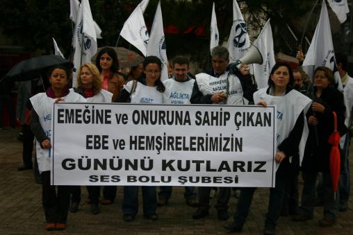 SES Sendikası Bolu Şubesi adına açıklama yapan İzzet Baysal Doğum ve Çocuk Hastanesi iş yeri temsilcisi Şükriye Üstün, “Her yıl olduğu gibi bu yılda Mayıs'ın 2. Haftası tüm dünya'da hemşirelik haftası olarak kutlanıyor. Ülkemizde de çeşitli etkinlikler düzenleniyor, seminerler yapılıyor, hemşire ve ebe meslektaşlarımıza çiçekler, flarlar dağıtılıyor. Bütün bu faaliyetler yürütülürken temel sorunlarımız görmezden geliniyor ve güneş balçıkla sıvanıyor. Bu güne kadar her nöbet çıkışında onlarca hastaya bakmanın psikolojik ve fiziksel yorgunluğunu sabah kahvaltısı niyetine ailemize sunduk. Birçoğumuz sağlık sisteminin piyasalaşmasıyla kendini müşteri zanneden hasta ve hasta yakınlarının sözlü ve fiziksel tacizine uğradı. Hepimiz kötü çalışma koşulları ve fazla mesailer yüzünden ailemize yabancı lastik. Sağlık ekip işidir denildi, yardımcı sağlık hizmetleri sınıfında sayıldık. Piyasacı sağlık sisteminin "toplam kalite7' kavramıyla kâğıtlara gömüldük, kırtasiye işinden mesleki görevimizi yapamaz olduk. Aynı işi yaptığımız halde 4/a, 4/b, 4/c, taşeron diye sınıflara ayrıldık, güvencesizleştirildik. Özel hastanelerdeki meslektaşlarımız haftada 80 saati bulan çalışma şartlarıyla köleleştirildi. 1. Basamakta uygulamaya konulan aile hekimliği ile birlikte, okullar okuyarak, emek vererek kazandığımız unvanlar elimizden alınıp "aile sağlığı elemanı" olduk. Sağlıkta dönüşümle değersizleştirildik, iş yükümüz katlandı, angaryaya boğulduk. Bize iş tarifleri yapıldı, çalıştığımız bölümde uzmanlaşmamız istendi, kurslar aldık ama yeri geldiğinde "ihtiyaca binaen" klinik klinik dolaştırıldık. İşkolumuzun yarısını oluşturmamıza rağmen hala mesleki bağımsızlığımız sağlanmadı, görevimiz olmayan işler verildi. Tüm sağlık emekçilerine fiili hizmet süresiyle erken emeklilik hakkı verilmelidir. Stajjer hemşirelere emeğinim karşılığı ücret olarak verilmelidir. Doğum izinleri ücretli hale getirilmelidir. Haftalık çalışma saati 35 saatle sınırlandırılmalıdır. Ücretsiz servis konulmalı, sosyal haklar sağlanmalıdır. 4/b, 4/c, taşeron çalışan tüm meslektaşlarımız kadroya alınmalıdır. Özel hastanelerde çalışan arkadaşlarımızın çalışma saatleri denetlenmelidir. Performans sistemi kaldırılmalı, temel ücret insanca yaşayacak düzeye çıkarılmalıdır” dedi.