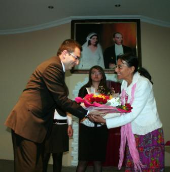 Ünlü yazar Cemalnur Sargut'a konferans sonunda Mudurnu Kaymakamı Alp Arslan, çiçek ve bir hediye paketi takdim etti.