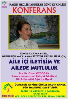 Anneler günü etkinlikleri kapsamında düzenlenen konferansa Ankara Üniversitesi İlahiyat Fakültesi Din Psikolojisi Öğretim Üyesi Doç. Dr. Öznur Özdoğan konuşmacı olarak katılacak. Konuyla ilgili açıklamalarda bulunan Bolu Kent Konseyi Kadın Meclisi Başkanı Hacer Aşık, “Çarşamba günü saat 20.30’da Bolu Belediyesi eski Nikah Salonu’nda ücretsiz olarak düzenlenecek etkinliğimize kadın- erkek tüm halkımızı davet ediyorum” dedi.