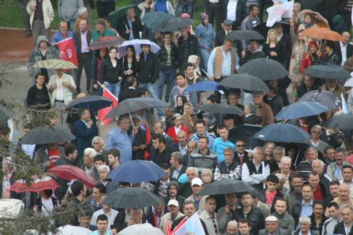 Cumhuriyet Halk partisi Genel Başkanı Kemal Kılıçdaroğlu’nun 12 Haziran seçim çalışmaları çerçevesinde dün ilimizde düzenlediği mitinge gelerek Genel Başkan Kılıçdaroğlu’nu dinlemek isteyen vatandaşlar yağmur nedeni ile zor anlar yaşadı. Kılıçdaroğlu’nun miting alanına geldiği anda şiddetini arttıran yağmurda, hazırlıklı gelen vatandaşlar şemsiyelerini açarak yağmurdan korunurken, hazırlıksız gelen birçok vatandaşlar ise ıslanmaktan kurtulamadı. Genel Başkan Kılıçdaroğlu yağmur nedeni ile konuşmasını kısa tuttu.