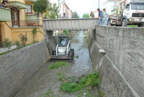Derenin içinin dışardan atılan maddelerle dolması nedeniyle, yağmurlar sonrası taşmasının yarattığı sıkıntının ve çevre kirliliğinin önüne geçmek amacıyla yapılan çalışma kapsamında; köprü altları insan gücüyle temizlenirken, dere boyunca biriken çöp, kum, çakıl birikintileri de bob-cat ile toplandıktan sonra, kepçeyle kamyona yüklenerek tahliye ediliyor.