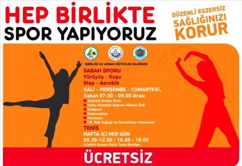 7’den 70’e tüm vatandaşların ücretsiz olarak yararlanabileceği spor programına katılmak isteyenler, Salı-Perşembe-Cumartesi sabah 07.30 -09.00 arası Atatürk Orman Parkı, Kalıcı Konutlar Deprem Müzesi önü, stadyum, Beşkavaklar, Karaçayır, İ.B. Ruh Sağlığı ve Hastalıkları Hastanesi’nde spor yapabilecekler.