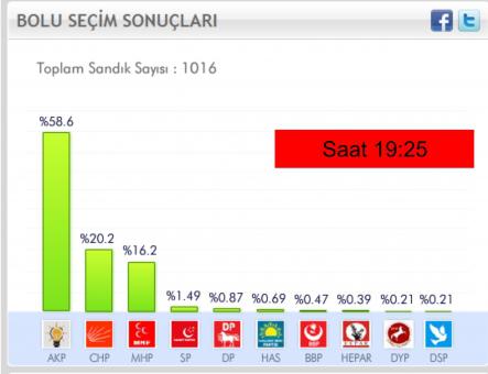 saat 19:40 itibariyle ilimizde 1016 sandıktan açılan 920 sandıktan Ak Partinin oy oranı merkezde yüzde 58.7, CHP’nin yüzde 20.1, MHP’nin ise yüzde 16.2.