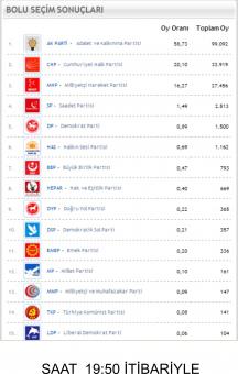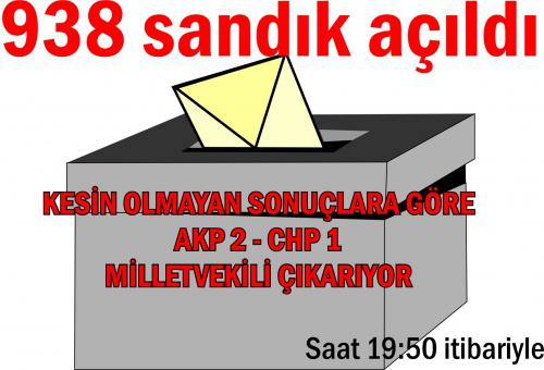 saat 19:50 itibariyle ilimizde 1016 sandıktan açılan 938 sandıktan Ak Partinin oy oranı merkezde yüzde 58.7, CHP’nin yüzde 20.1, MHP’nin ise yüzde 16.2.