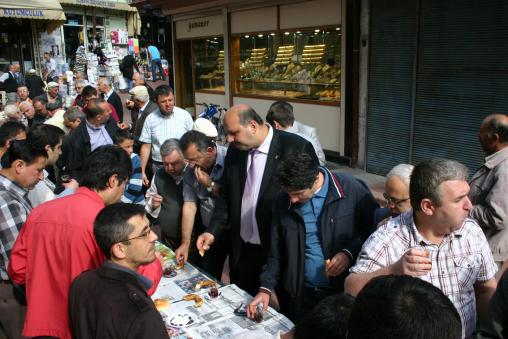 Bolu Müftülüğü ve Yukarı Çarşı Koruma ve Güzelleştirme Derneği’nin katkılarıyla her Cuma günü, saat 9.00’da yapılan toplu dua eşliğinde esnaf iş yerlerini açıyor. Bu haftada esnafın ve halkın katılımıyla gerçekleşen Büyük Cami önünde ki Ahi duasına MHP Milletvekili Adayı Murat Yapıcı ve AKP Milletvekili Ali Ercoşkun katıldı. Yukarı Çarşı Esnafının ve milletvekili ile milletvekili adayının katıldığı dua sonrası katılımcılara simit ve beyaz peynir zeytin ve çay ikram edildi.