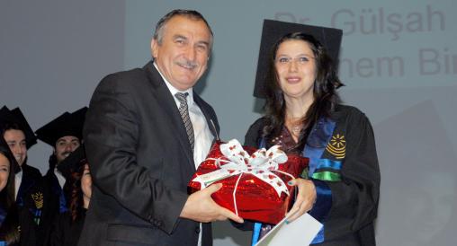 AİBÜ Kültür Merkezi Mavi Salon’da düzenlenen yemin töreninde açılış konuşmalarının ardından gerçekleşen ödül töreninde Belediye Başkanı Alaaddin Yılmaz AİBÜ Tıp Fakültesi 2011 yılı mezunu dönem birincisi Dr. Gülşah Mete’yi başarılarından dolayı kutlayarak laptop hediye etti. Başarılarının devamını dileyen Başkan Yılmaz, “Umarım bundan sonraki yaşantında da başarılı olursun. Seni kutluyorum” dedi.
