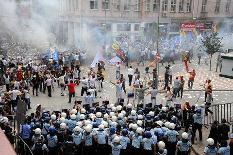 Çıkan arbedede biber gazı kullanan polis, müdahale ettiği grubu dağıttı. Gruptan bazı kişiler bina önüne pet şişe ve çeşitli malzemeler fırlattı.