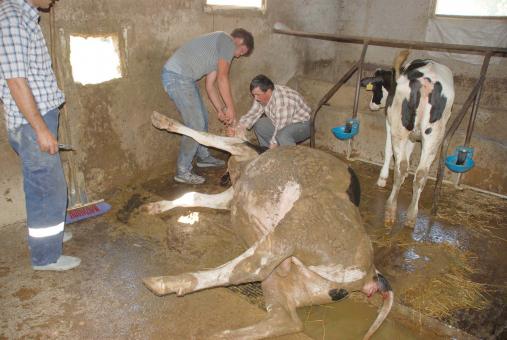 Bir süre sonra çiftliğe gelen Ercan, boğazından hortum sokarak hayvanın midesini yıkadı ve bıçakla açılan bölgeye müdahalede bulundu. Bir süre sonra üzerine soğuk su dökülen hayvan, ayağa kalktı.