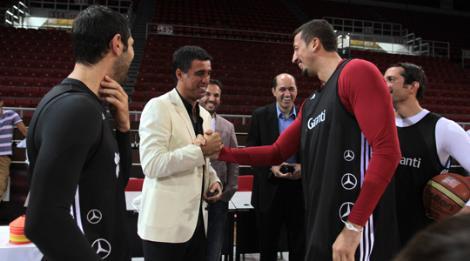 “12 Dev Adam”ın Abdi İpekçi Spor Salonu'nda yaptığı idman öncesinde TürkiyeBasketbol Federasyonu Başkanı Turgay Demirel ile salona gelen Hakan Şükür, başantrenör Orhun Ene ve oyuncularla sohbet etti.
