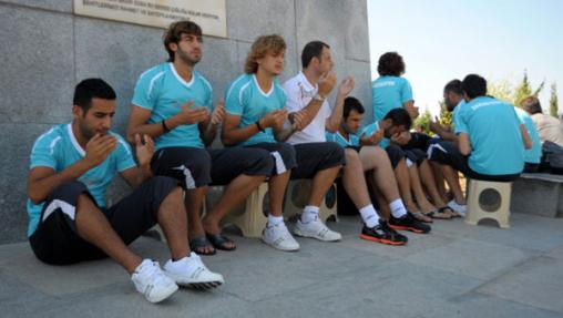 Bank Asya 1. Lig ekiplerinden Sakaryaspor'un futbolcuları, Kartalspor ile yapılacak hazırlık maçı öncesi takım otobüsü ile Serdivan'daki Deprem Şehitliği'ne geldi. Şehitlikte iki imamın okuduğu Kur'an-ı Kerim'in ardından yeşil siyahlı sporcular, depremde yaşamını yitiren kişiler için dua etti.