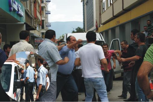 Sinirlerine hakim olamayan esnaflar küfürleşmenin ardından tekmeli, yumruklu kavgaya tutuştular. Yumrukların havada uçuştuğu kavgaya esnafların arkadaşları da katılınca kavga büyüdü. Halkın zorlukla ayırabildiği kavgada taraflar sakinleşmeyince polis devreye girdi. PTT önünden çift yönlü gelen iki araç sahibi, yolu daraltan araçlar tarafından geçemeyince suçu birbirlerinde buldular. Karşılıklı küfürlerle başlayan tartışma kısa sürede büyüyerek yerini yumruklara bıraktı. Cadde üzerindeki esnaflar tarafları yatıştıramayınca çalışınca olay daha da büyüdü. Birçok vatandaş kavgayı meraklı gözlerle izlerken sıkıştan trafik ise sürücüleri çileden çıkardı. Halk ve polis tarafından kısa süreli tartışma yaşanırken kavga eden taraflar polis ekipleri tarafından karakola götürüldü