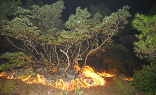 Datça ilçesinde TRT vericileri mevkisinde gece saatlerinde henüz belirlenemeyen nedenle başlayan orman yangını rüzgarın etkisiyle hızla yayıldı. Karanlık nedeniyle hava araçlarıyla müdahale edilemeyen yangın, sarp bölgeye çıkabilen arazöz ve orman işçilerince söndürülmeye çalışıldı. Engebeli arazi koşulları nedeniyle arazözlerin bölgeye ulaşabilmesi için iş makineleri ağaçları keserek yol açtı. Yaklaşık 50 arazöz ise iş makinelerinin 7 saat çalışarak açtığı yollardan yangının çıktığı noktaya ulaştı. Aydın ve Muğla'nın ilçelerinden bölgeye getirilen 250 orman işçisi yaklaşık 4 kilometre yürüdükten sonra yangının etkili olduğu 5 farklı noktadan yangına müdahale etti. Havanın aydınlanmasıyla birlikte 6 helikopter ve 2 uçak da yangın söndürme çalışmalarını katıldı. Sabah saatlerinde NTV’nin canlı yayınına katılan Muğla Orman Bölge Müdürü Ali Yıldırım, söndürme çalışmaları hakkında bilgi verdi. Yangının kısmen kontrol altına alındığını ifade eden Yıldırım, “Riskli bir durum yok” dedi. Uzak olması nedeniyle alevlerin yerleşim yerlerini tehdit etmediğini belirten Yıldırım, yangının enerji nakil hattından kaynaklanmış olabileceğini söyledi. SAATLER SONRA KONTROLDE AKREP SOKTU Çalışmaları sırasında Marmaris yangın söndürme ekibinde görevli Nurhan Urkan'ı ise akrep soktu. İŞÇİLER YORGUN DÜŞTÜ Gece boyunca alevlerle mücadele ederek yorgun düşen işçilerden bazıları, yanan ormanlık alanların yakınında uyuya kaldı.