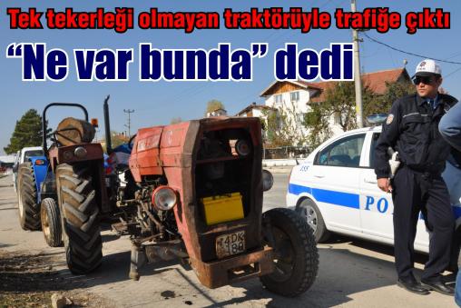 Olay Karaçayır Mahallesi'nde meydana geldi. Sultanbey köyünde çiftçilik yapan Hakan Yılmaz, tarlada çalışırken 14 DK 189 plakalı traktörünün ön sağ tekerleğinin kırılması sonrasında köyden şehir merkezine doğru tek tekerlekle geldi. Yaklaşık 5 kilometre tek tekerlekle gelen Hakan Yılmaz, Karaçayır Mahallesi'nde polis tarafından durduruldu. Sürücü, polislere, tarlada çalışırken tekerleğin kırıldığını belirterek "Ben köyden buraya geldim. Traktörü sanayiye götürüp tekerleği tamir ettirecektim. İzin verin