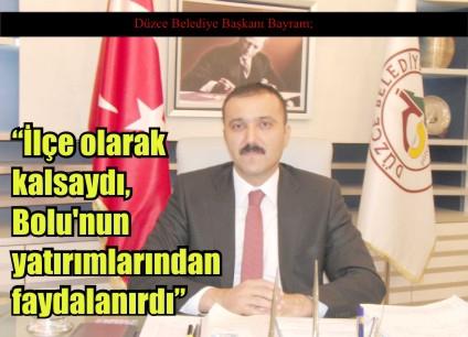 Bayram, Düzce'nin depremin ardından il olması üzerine her şeyin değişeceği yönünde bir algı oluştuğunu ifade ederek, şöyle konuştu: "Kamu adına hiçbir yatırım yapılmamış, hiç bir ödenek gelmemişse il olmanın böyle bir ortamda hiç bir faydası olmaz. Düzce ilçe olarak kalsaydı Bolu'nun ödenek ve yatırımlardan faydalanırdı. Bugün Erciş için konuşursak, uygulama orada böyle yapılmaz tabi ki. Erciş il olup yapılanmasını hızlı bir sürede hem bütçe açısından, hem idari anlamda çok hızlı bir şekilde yaparsa bizim yaşadığımız süreç yaşanmaz. Depremden sonra Düzce il olursa ertesi sabah her şey değişecek gibi bir algı oluşmuştu. Böyle bir şey olmadı, zaten olamazdı. Bir hayal kırıklığı oluştu"