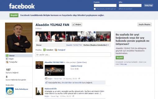 Bolu Belediyesi sosyal medyayı kullanırken, Belediye Başkanı Alaaddin Yılmaz için ise Facebook’ta açılan fan sayfası da bulunuyor. Alaaddin Yılmaz’ın kişisel bilgileri, video ve fotoğraflarının bulunduğu “Alaaddin Yılmaz Fan” sayfasında, belediyenin yaptığı çalışmaların da videoları bulunuyor. Sayfada en son video güncellemesi 26 Ağustos tarihinde “Çöpten Enerji” başlıklı video ile yapılırken, sayfayı 187 kişi beğendi.