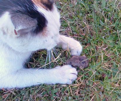 Havaların soğumasıyla birlikte özellikle tarla ve mezarlıklarda artış gösteren fareler, en büyük düşmanları kedilerin kurbanı olmaya devam ediyor. Öğle saatlerine doğru yuvasından çıkan yavru fareyi yanından geçen kedi yakaladı. Fare yavrusunu çimenlik bölgeye götüren kedi bir süre fareyle oynadı sonra yedi.