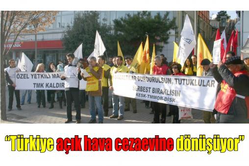 Sık sloganların atıldığı basın açıklamasında KESK Dönem Sözcüsü Dursun Yenin, AKP ve iktidarı hedef alarak açıklamasını şöyle sürdürdü: “AKP’nin ‘İleri demokrasi’ balonu ve yalanı orta yerde patladı. Bırakalım ‘ileri’sini, en geri demokrasilerde bile olmayan uygulamalar günlük yaşamımızın bir parçası haline geldi. AKP’ye göre en tehlikeli iş ise AKP karşıtlığıdır. Türkiye bir açık hava cezaevine dönüşüyor. Her yeni güne tutuklama haberleriyle başlıyoruz. İnsanca yaşamak isteyen işçiler, suyunu ve toprağını korumak isteyen köylüler, parasız eğitim isteyen öğrenciler, ülkemizde füze kalkanı istemeyenler, gerçeğin peşinde koşan gazeteciler, adalet arayan avukatlar yani haklarını arayan herkes tutuklanıyor. Tutuklamalar, seçilmiş milletvekillerine ve belediye başkanlarına kadar uzanıyor. AKP hükümetini eleştiren, AKP politikalarına karşı çıkan herkes tutuklama endişesi yaşıyor. Sıra ne zaman bana gelecek, korkusuyla düşünmez, talep edemez, hareket edemez hale getirilmek isteniyoruz”