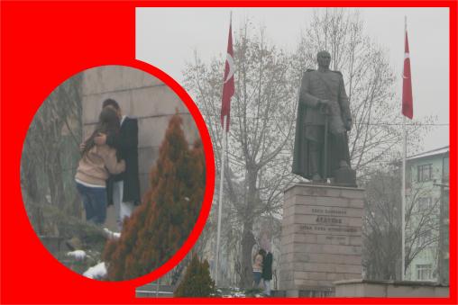 Genç bir çift aşklarını Ata’nın huzurunda birbirlerine sarılıp öpüşerek pekiştirdiler ve ilginç görüntüler sergilediler. Kendilerine en güveniler yer olarak Atatürk Anıtı’nın kenarını seçen gençler, bol bol öpüşüp, birbirlerine sarılarak, soğuk havada aşk ateşleriyle ısınmaya çalıştılar. Objektifimize takılan bu çift, her halde kendilerine en güveniler yer olarak Atatürk’ün heykelinin yanını gördüler. Resimlerinin çekildiğini bile fark edemeyen genç çift, aşklarının ne kadar derin olduğunu adeta ispatladılar. Hava buz gibiydi ama bu gençlerin aşları Anıt Parka’daki karları bile eritecek dereceye ulaşmıştı anlaşılan.