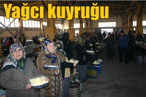Kendi ürettikleri yağları satmak isteyen köylü kadınları uzun kuyruklar oluşturarak, yağlarını sergilediler. Ellerindeki kaplarda tereyağlarını sıraya dizilerek sergileyen köylü kadınları, adeta merasim geçişi törenini andırdılar. Tereyağlarının kilosunu 18 liradan satmaya çalışan köylü kadınları yağıcı kuyruğunu oluşturması dikkat çekti.
