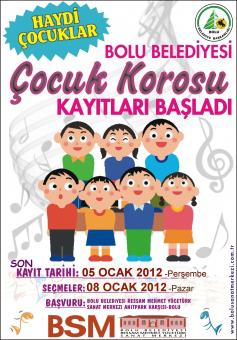 Yeni kurulacak olan “Çocuk Korosu”na katılmak isteyen, 8-12 yaşları arasındaki çocuklarımızın ön kayıtlarının, 05 Ocak 2012 tarihine kadar aileleri tarafından, Bolu Belediyesi-Ressam Mehmet Yücetürk Sanat Merkezi’ne yaptırılması gerekiyor.. Alanlarında uzman müzik eğitimcileri eşliğinde yapılacak koro çalışmalarına katılacakların kesin listesi ise, 08 Ocak 2012 tarihinde yapılacak seçmelerden sonra belirlenecek.