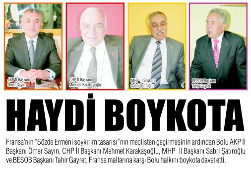 CHP İl Başkanı Mehmet Karakaşoğlu’da, konuyla ilgili yaptığı açıklamada, Bolu halkının, Fransa mallarına karşı boykot yapması gerektiğini, İl teşkilatı olarak boykotta bulunduklarını belirterek, açıklaması şöyle sürdürdü: “Soykırım yoktur diyene hapis ve para cezası getiren yasa Fransa parlamentosun da kabul edildi. Fransa, 2012’de yapılacak Cumhurbaşkanlığı seçimleri nedeniyle, kendi iç kamuoyunu tatmin için Ermeni yasası hazırladı. Milyonlarca Ermeni seçmene şirin görünüp oylarına göz dikti. Öncelikle emperyalizmin öncüsü Fransa kendi tarihine baksın. CHP olarak, Fransa’nın tutumu karşısında Bolu halkını Fransız mallarına karşı boykoto davet ediyoruz ve buna destek olanlara da, bizde destek veriyoruz” diye konuştu.