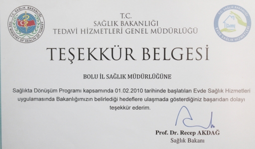 Bolu İl Sağlık Müdürü Dr. Dursun Koç, uygulamada emeği geçenlere teşekkür ederek, "Hastalık ya da yaşlılık gibi sebeplerden ötürü sağlık kuruluşlarımıza ulaşamayan hastalarımız için 'Evde Bakım Projesi' adını verdiğimiz hizmeti başlattık. Hastalarımız bize gelemeyecek durumdaysa biz hastalarımıza gidip onların sağlık sorunlarını çözümlüyoruz. İlimizde sağlık alanında vatandaşlarımıza en son teknoloji ve imkanla zorluk değil kolaylıklarla sağlık hizmeti vermeye devam edeceğiz. Sağlık Bakanımız tarafından ilimize sunulan bu teşekkürü tüm sağlık ekiplerimiz adına alıyor, emeği geçen herkese teşekkür ediyorum" dedi.