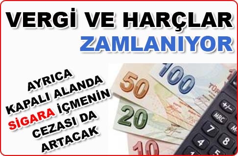 Pasaport harçları: 6 aya kadar: 77 TL; 1 yıl 113; 2 yıl için 184; 3 yıl 261; 3 yıldan fazla süreli 368 TL. Silah taşıma ruhsatı 515; bulundurma ruhsatı 824 TL olacak. A sınıfı ehliyet 92 TL; B sınıfı 278 TL; F ve H sınıfı 92 TL. Fiş veya fatura vermeme ile almamanın cezası 187 TL; fiş-fatura bulundurmama 8 bin 816 TL olacak.Yeni yılda motorlu taşıtlar vergisi de yüzde 10.2 oranında artacak. Örneğin 1300 ila 1600 cc motor hacminde, 1 ila 3 yaşındaki bir otomobilin vergisi 697 liradan 768 liraya çıkacak. Aynı motor hacminde olup, 7 ila 11 yaşındaki bir otomobilin motorlu taşıtlar vergisi ise 304 liradan 335 liraya yükselecek. Yine 1 ila 3 yaşında, 2 bin ila 2500 motor hacmindeki lüks bir otomobilin vergisi ise 2 bin 897 lirayken 3 bin 194 lira olacak.