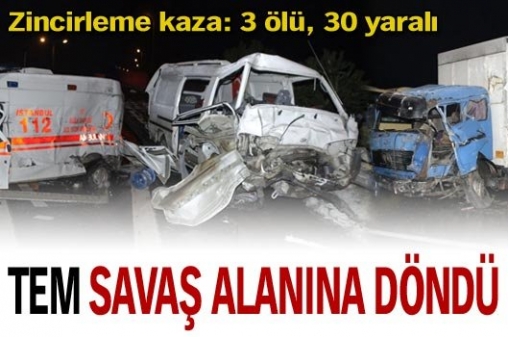 TEM Otoyolu Tuzla bölgesinde aşırı buzlanma sebebiyle 2'si ambulans, biri polis aracı olmak üzere 14 araç birbirine girdi. Zincirleme kazada 3 kişi öldü, 30 kişi de yaralandı. Savaş alanına dönen yolda kaza sebebiyle araç kuyruğu 5 Kilometreyi aştı. Olay saat 01:00 sıralarında Tuzla Şekerpınar mevkiinde meydana geldi. Sıcaklığın sıfırın altına düşmesi sebebiyle TEM otoyolunda yer yer buzlanmalar meydana geldi.