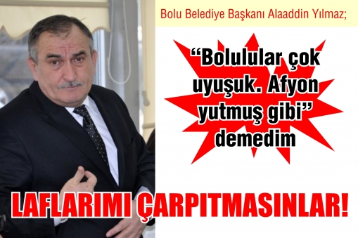 Bolu Belediye Başkanı Alaaddin Yılmaz, geçtiğimiz günlerde yerel basında çıkan “Bolulular çok uyuşuk. Afyon yutmuş gibi” sözlerinin bazı kesimler tarafından çarpıtıldığını ifade ederek, “Ben bu lafı Bolu halkı için söylemedim. Hizmetlerimizi yavaşlatan veya sahip çıkmayan bazı kesimler için ifade ettim. Mesela kendi yaptıkları Kent Meydanı Projesi’ne sahip çıkmayan Mimarlar Odası gibi. İşte uyuşukluk burada” dedi.