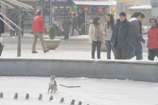 Belediye Meydanındaki buz tutmuş havuza giren bir kedi yaptığı ilginç hareketlerle bir anda vatandaşların büyük ilgi odağı oldu. Buz üzerinde adeta paten yapan kedi, bir taraftan düşmemek için çaba gösterirken, diğer taraftan da dans eder gibi hareketler yapması görenleri şaşkına çevirdi.