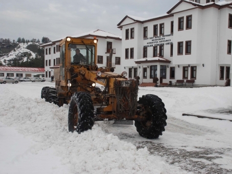 Kar kalınlığının 25 santimetreye ulaştığı Mudurnu'da ekipler, 4 mahallede yaklaşık 5 kilometre uzunluğundaki yolda greyder ve dozerlerle karla mücadele çalışması gerçekleştirdi.