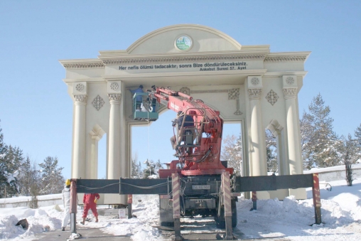 Mezarlık girişine yapılan giriş takı, bir adet geniş araç geçişine olanak sağlayan ana bölüm ile sağlı sollu konumlanan yaya geçişi için oluşturulmuş iki adet yaya giriş çıkışına sahip. Ön görünüşünde dört adet mukarnas başlıklı sütun bulunuyor. Üst kanopi kısmında "Her nefis ölümü tadacaktır; sonra bize döndürüleceksiniz." Ankebut Suresi 57. Ayet-i Kerimesi ve Gerede Belediyesi logosu bulunuyor. Genel tasarım aşamasında Osmanlı motifleri içermesi esas alınarak o mimari özellikler göz önünde bulundurularak dizayn edildi.