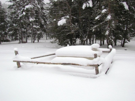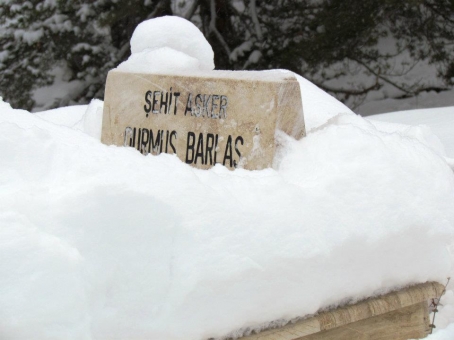 Burası Bolu’nun Seben ilçesi yakınlarda bulunan bir yayla. Haccağız Yaylası…Fotoğrafta görüldüğü gibi etrafı tahtalarla çevrilmiş bir mezar. Bu mezar ise bir şehide ait. Adı da Durmuş Barlas. Şehit askerin sadece mezar taşı görünüyor. Üzeri ve etrafı karla kaplanmış. Ormanın derinliklerinde tek başına dağları bekliyor. Ne zaman ve nerede şehit olduğunu ise bilmiyoruz. Mezar taşına dokunmadık. Doğanın kanunu, üzeri karla kaplanmış ve görünmez hale gelmiş. Ama bildiğimiz bir şey var. O artık dağları bekliyor. Tabiî ki şehidin mezarının karlar altında kalması, hemen akla “Sarıkamış üstünde kar” türküsünü getiriyor. Burası Sarıkamış değil ancak türküsünü hatırlatalım istedik.