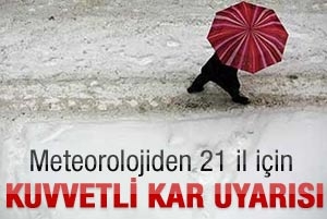 Adıyaman, Batman, Diyarbakır, Gaziantep, Mardin, Siirt, Şanlıurfa, Şırnak, Kahramanmaraş, Çorum, Çankırı, Yozgat, Kırıkkale, Kırşehir, Malatya, Elazığ, Bingöl, Bitlis, Tunceli, Şırnak ve Hakkari çevrelerinde kuvvetli kar yağışı uyarısında bulunuldu. Meteoroloji Genel Müdürlüğü'nden yapılan açıklamada, ''Kar yağışının Güneydoğu Anadolu, Kahramanmaraş, Çorum, Çankırı, Yozgat, Kırıkkale, Kırşehir, Malatya, Elazığ, Bingöl, Bitlis, Tunceli, Şırnak ve Hakkari çevrelerinde kuvvetli olması beklendiğinden yaşanabilecek olumsuzluklara karşı ilgililerin ve vatandaşların dikkatli ve tedbirli olması gerekmektedir'' denildi.