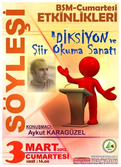 Bolu Belediyesi Ressam Mehmet Yücetürk Sanat Merkezi, “BSM Cumartesi Etkinlikleri”nin bu haftaki bölümünde, Diksiyon ve Şiir Okuma Sanatı” ele alınacak. Aykut Karagüzel tarafından sunulacak olan “söyleşi” programı, 03 Şubat Cumartesi günü BSM’de gerçekleştirilecek.