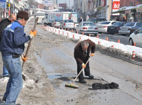 Yoğun kar yağışı sonrası eriyen karlar yollarda çukur oluşmasına sebep oldu. Sürücülere zor anlar yaşatan çukurlar belediye ekipleri tarafından onarılmaya başladı. İzzet Baysal Caddesi Büyük Cami Mahallesi'nde bulunan ana yolda oluşan büyük çukur sıcak asfalt dökülerek kapatıldı. Ekipler hummalı bir çalışma yürüterek çukurları kapattı. Kar yağışının etkisini yitirip yerini güneşli havaya bırakması sonrası esnaf harekete geçti. Günlerdir yoğun kar yağışının devam etmesi nedeniyle temizlik yapamayan esnaf, dükkanlarının önlerinde biriken karları temizledi.
