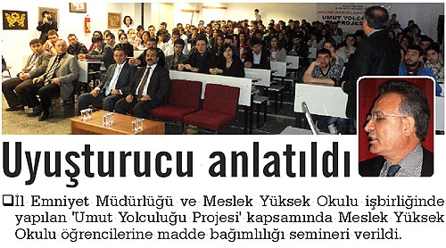 Gerede'de öğrencilere madde bağımlılığı semineri verildi. Bolu İl Emniyet Müdürlüğü ve AİBÜ Gerede Meslek Yüksek Okulu işbirliğinde yapılan 'Umut Yolculuğu Projesi' kapsamında üniversite öğrencilerine madde bağımlılığı semineri verildi. Gerede Meslek Yüksek Okulu'nda düzenlenen seminere okulda okuyan öğrencilerin yanı sıra bazı öğretmenler ve yüksek okul müdürü Nurettin Akçakale katıldı. Bolu İl Emniyet Müdürlüğü Kaçakçılık ve Organize Suçlarla Mücadele Şube Müdürü Başkomiser Şükrü Güler, slayt gösterisiyle öğrencileri bilgilendirdi. Seminerde madde bağımlılığının süreçleri, kanuna aykırılık durumu ve etkenleri ile korunma yolları anlatıldı.İstatistiklere göre, Türkiye'de her yıl yasa dışı madde kullanımının yükselişte olduğunu belirten Başkomiser Şükrü Güler, öğrencilere yasadışı madde kullanımı, satışı ve temin edilmesi konularında uzak durmalarını söyledi.Aynı seminerde uyuşturucu madde kullanan kişilerin psikolojik ve fiziksel görüntüleri de resimler halinde öğrencilere anlatıldı.Başkomiser Şükrü Güler, seminer sonunda Gerede MYO öğrencilerinin sorularını yanıtladı.