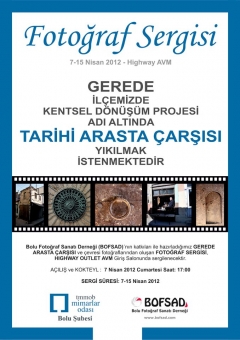 Gerede Belediyesi tarafından başlatılan kentsel dönüşüm projesi kapsamında yıkılmak istenen tarihi Arasta Çarşısının korunmasını isteyen TMMOB Mimarlar Odası Bolu Şubesi, ilginç bir eyleme imza atacak. Sessiz bir protesto niteliği de taşıyan çalışmada, Bolulu fotoğrafçılardan oluşan Bolu Fotoğraf Sanatı Derneği (BOFSAD) Üyelerinin tarihi çarşıda çektikleri fotoğraflar, Highway Outlet’te sergilenerek vatandaşların tepki vermesi sağlanacak. Bilinç oluşturmaya yönelik çalışmanın Highway’de yapılacak olması, sergiyi izleyen kişilerin sayısında da ciddi bir artış sağlayacak. Bolu Mimarlar Odası Bolu Belediyesi ile Hükümet Meydanı projesinde de karşı karşıya gelmişti.