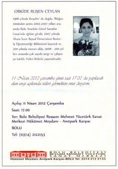 11-21 Nisan tarihleri arasında gezilebilecek olan sergi açılışı, 11 Nisan 2012, Çarşamba günü, saat:17.oo de yapılacak. Orkide Ruşen CEYLAN: 1988 yılında Kırşehir’de doğdu. İlköğreniminden sonra, 2003-2007 yılları arasında, Bolu Anadolu Güzel Sanatlar Lisesi’nde eğitim gördü. 2007 yılında, Abant İzzet Baysal Üniversitesi-Resim İş Öğretmenliği Bölümünü kazandı ve 2011 yılında mezun oldu. 2008-2011 yılları arasında çok sayıda, sergi ve çalıştaya katıldı. Halen Bolu’da yaşamaktadır.