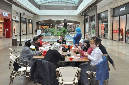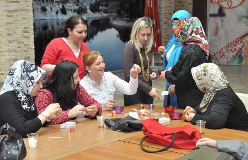 Bolu'da Dağı'nda bulunan dev alışveriş merkezinin yönetimi ev hanımları ve boş vakitlerini değerlendirmek isteyen kadınlar için el işi-tasarım kursu açtı. Kursa katılan kadınlar bütün hünerlerini sergileyerek ebru ve tezhip sanatı başta olmak üzere birçok eser üretiyor. Ellerinde iğneler, iplikler ve boncuklarla kolye yapan kadınlar el emeği göz nuru ürünlerinin sergilenmesini bekliyor. Yaklaşık 70 gönüllü kadının belirli günlerde gelerek yaptıkları çalışmalar ilerleyen günlerde sergilenecek. Ürünlerin satışından elde edilen gelirler ise şehit ailelerine bağışlanacak.