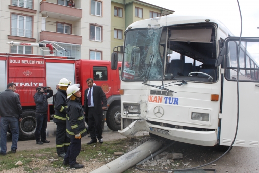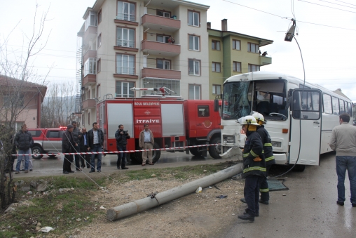 Arçelik’te mesaisi biten personelle birlikte şehir merkezine dönen Adnan Yüksel yönetimindeki 14 AU 703 plakalı servis aracı Karadere Caddesi üzerinde arıza yaptı. Direksiyon kutusu kilitlenen otobüs kontrolden çıkarak, yol kenarındaki beton direğe çarptı. Araçta hasar meydana gelirken, ön koltuklarda oturan iki fabrika işçisi hafif şekilde yaralandı. Olay yerine çok sayıda ambulans, polis ve itfaiye aracı sevk edilirken, kazada can kaybı yaşanmaması tek teselli oldu.