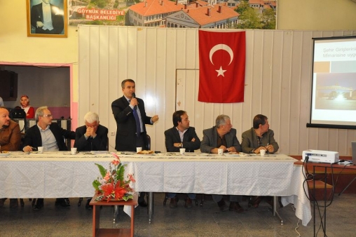 Göynük Belediyesi tarafından düzenlenen “Bilgilendirme ve İstişare Toplantısı” ilçe esnafının katılımıyla gerçekleşti. Belediye Düğün Salonu’nda gerçekleştirilen toplantıya ilçe esnafının yanı sıra, Belediye Meclis Üyeleri ve AK Parti İlçe Başkanı Mustafa Bayraktar da katıldı. İlçe esnafının Göynük ile ilgili görüşlerinin değerlendirildiği toplantıda Göynük Belediye Başkanı Kemal Kazan, görev süresi boyunca yaptıkları çalışmalar ve hazırladıkları projeler hakkında bilgiler verdi. Son dönemde tanıtım atağına geçen Göynük’ün ‘marka kent’ hedefine adım adım ilerlediğini kaydeden Kemal Kazan, “Göynük el ele verdi. Güzel ilçemizin hak ettiği noktaya gelmesi için hep birlikte hareket etmek, güçlerimizi birleştirmek istiyoruz. Birlikten güç doğar. Herkesin yardımlaştığı yerde işler yarım kalmaz. Güzelliklere halkımızla birlikte ulaşacağız. Büyük bir tanıtım atağına başladık. Sonuçları ortaya çıkmaya başladı. Göynük ‘marka kent’ hedefine adım adım ilerliyor” dedi. Göynük’ü sadece Bolu’nun değil, Türkiye’nin parlayan yıldızı yapmak istediklerini belirten Kazan, ilçe esnafına seslenerek, “Yaptığımız çalışmalar hakkında sizleri bilgilendirmek ve istişare etmek için bu toplantıları düzenliyoruz. Sizlerin fikir ve görüşleri bizim için çok önemli. İlçemize bir şeyler yapacaksak bunu hep birlikte istişare ederek yapacağız. Göynük, kendi halkı ile yükselecek. Herkes hedefimize sıkı sarılırsa, sonucunda gelen güzellikleri beraber yaşayacağız. Sizler ‘marka kent’ hedefimizde en önemli halkada yer alıyorsunuz” şeklinde seslendi. Görev süresi boyunca ilçeye 20 milyon TL tutarında yatırım yapıldığını ifade eden Kazan, bunun 11,5 milyon TL’sinin TOKİ Konutları için harcandığını, kalan miktarın ise çevre düzenlemesi, alt ve üst yapı çalışmalarına harcandığını belirtti.