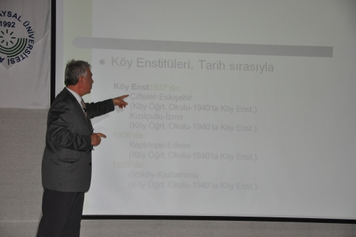 Üniversitemiz Kültür Sanat ve Ören Yerleri Gezi Topluluğu tarafından Köy Enstitülerinin 72. Yıldönümü kapsamında gerçekleştirilen konferansta, Abant İzzet Baysal Üniversitesi(AİBÜ) Eğitim Fakültesi Öğretim üyesi Yrd. Doç. Dr. İbrahim Kıbrıs, Köy Enstitülerinin Cumhuriyet sonrası kuruluş ve gelişim süreçlerini aktardı.