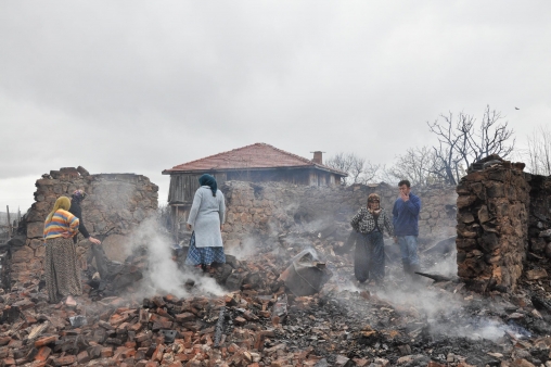 Kıbrıscık'ın Çökeler Köyü'nde dün fırtına nedeniyle samanlığın üzerine devrilen elektrik direği yangına neden oldu. 4 ahşap ev, 8 ahır ve 7 samanlık alev alev yandı, 4 büyükbaş hayvan ise telef oldu. Yangında evlerin kaybeden Ramazan Aydoğan, Kemal Güneç ve Şevki Güneç geceyi komşuları ve akrabalarında geçirdi.