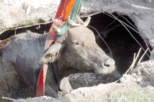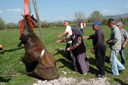Yeni Akçakavak Köyü'nde yaşayan Huri Kılıçarslan dün merada ineklerini otlatırken, bir hayvan beton kapağı açık bırakılan foseptiğe düştü. Çukurdaki ineği gören köylüler, itfaiyeyi arayarak ihbarda bulundu. Köy merasına gelen Bolu Belediyesi İtfaiye Müdürlüğü ekibi, yaklaşık 1 metre genişliğindeki yerden düşen ineği çıkarabilmek için diğer beton kapağı vinçle kaldırdı. İtfaiyeciler ineğin vücuduna ve boynuzuna halat bağladı. Huri Kılıçarslan elleri titreyerek ineğinin kurtarılmasını izlerken, köylüler ise hayvana bakarak, "Dayan kızım, hadi kızım" dedi. Yaklaşık yarım saat süren çalışmanın ardından inek vinçle çukurdan çıkarıldı.